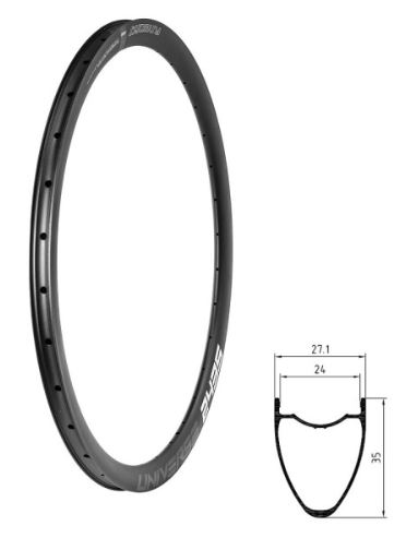 The new Universe 2435 is the larger sibling of the Universe 2428, featuring a 7mm deeper rim profile for enhanced aerodynamics. Its 24mm internal width accommodates high-volume tires, while its high stiffness and aerodynamic efficiency ensure superior comfort, off-road capability, and exceptional durability. The hookless rim flanges provide increased impact resistance thanks to their thicker sidewalls. Additionally, the inside of the rim flanges is equipped with the THG (Tire Hold Grooves) system, guaranteeing optimal tire seating and retention. Constructed from high-strength New Era Alloy, the rim remains exceptionally stiff despite its remarkably light weight. Its tubeless-ready design allows for easy tubeless setup. This rim is exclusively for tubeless-ready tires and can accommodate tire widths from 30mm to 65mm, with a maximum air pressure of 5 bar. Details: